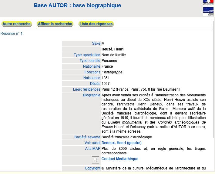 Parmi les 1900 résultats triés par POP pour « Heuzé Reims » il y a certainement encore des images à découvrir… d’autant plus qu’apparait aussi dans la base une série de photos libellées « Heuzé Y » datées souvent 1910 et concernant une campagne photographique dans l’Aisne, Laon, Fère-en-Tardenois, Mont-Notre-Dame, etc. mais aussi des photos non datées des statues déposées de la Maison des Musiciens, [9-1917 démontage par Deneux]…Il s’agit d’Yvonne (1883-1955), fille de H.Heuzé et future épouse de H. Deneux.